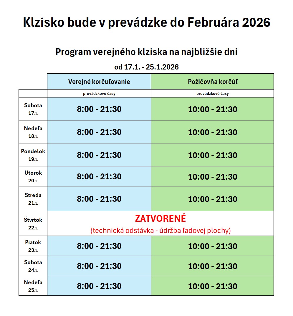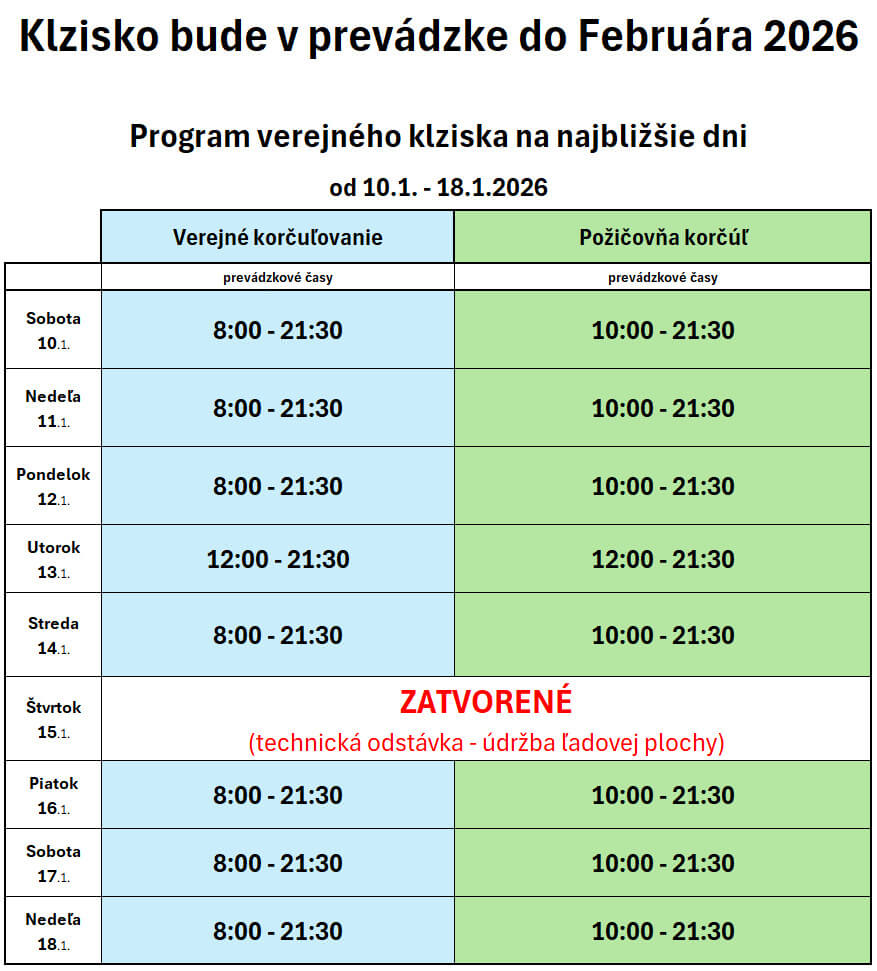 ⏰ Otváracie hodiny klziska: